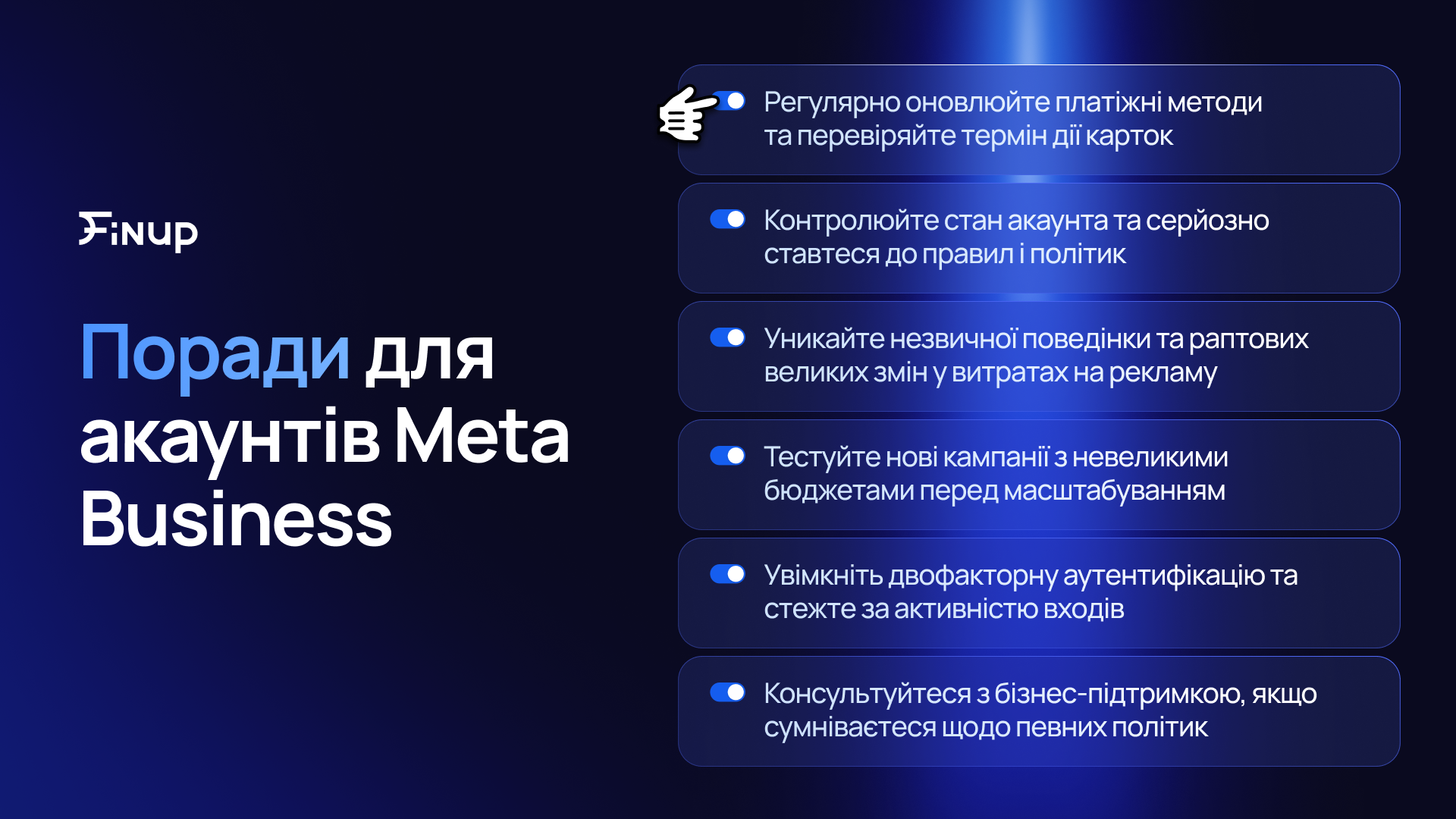 Якщо ваш рекламний акаунт Instagram заблокований, це може статися через мінусовий баланс. Вам потрібно поповнити картку, щоб оплатити витрати на рекламу та відновити можливість запуску рекламних кампаній. Використовуйте нову картку Finup, яку ви вже підключили, адже картка, яку Instagram визнає надійною, зменшує ризик відхилення платежу.